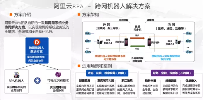 此外,阿里云RPA团队独家研发的“跨网机器人解决方案”成为亮点之一,此机器人可实现外网和内网在完全隔离情况下的数据传输,极大提升数据传输的安全性。其技术原理则是:内外网之间可通过两台同步机之间的图像识别技术传输数据,再通过RPA机器人完成系统数据自动一体化录入,目前已经在新疆政府、重庆城市大脑等众多政务领域获得最佳实践和落地。