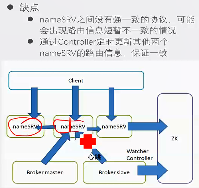 - Broker的心跳信息只上报给Controller,再由nameServer复制给其他nameServer nameServer地位变成不对等,有Master的概念。 切换过程中,通过Controller来切换slave变成Master,同时更新其他两个nameServer的路由信息。