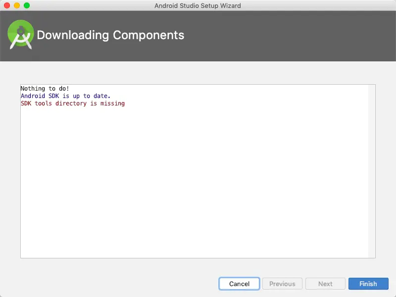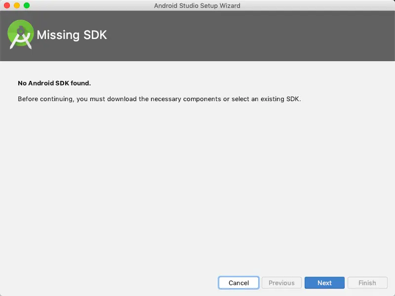 - 此时如果已经下载处理过Android SDK,则在下方Android SDK Location处选上对应的路径,按步骤处理即可,我这里没有下载,再次点击Next,显示如下: