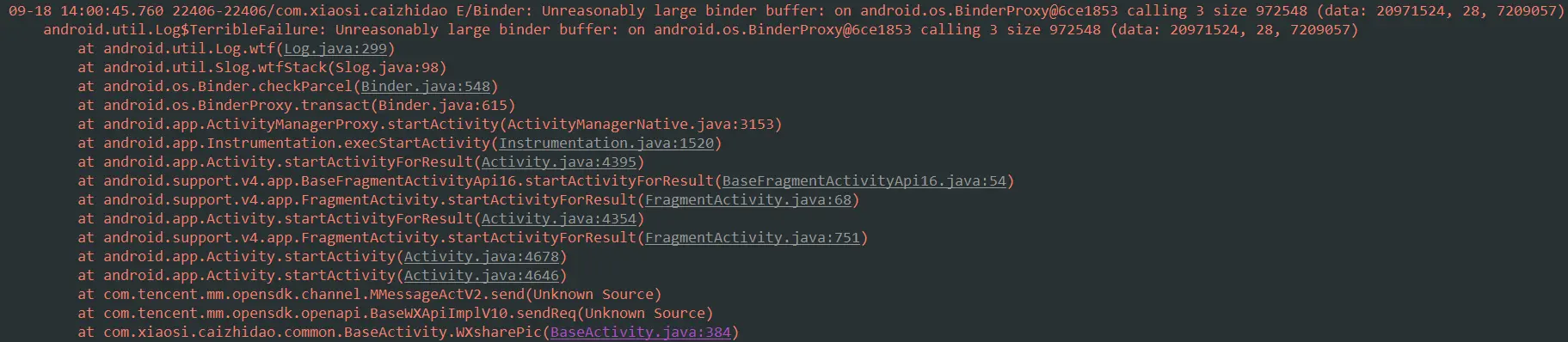 错误日志是Binder类出现的,字面意思是数据过大。查看微信的SDK源码可以发现实际上调用微信API,微信会将图片传递给一个新的活动。