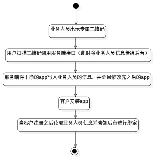 由流程图可知,并没有用户填写业务人员信息这一步,因此在用户下载的APP中就已经携带了业务人员的信息。