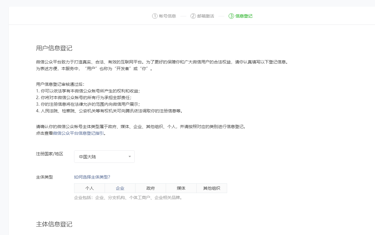 这里可以选个人,企业,政府,媒体,其他组织,但对于个人,对于商业上的小程序是不能通过的,如果是企业就选择企业,权限相对个人也会多一点。