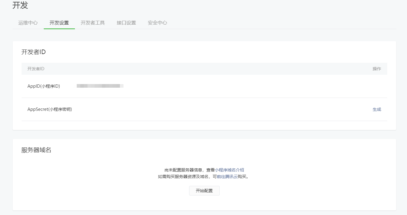 开发设置中有个小程序的AppID,这个AppID很重要,不要轻易泄露给别人,服务器域名的配置一定是备过案的域名,另外要配置https ,且是ssl 认证的。