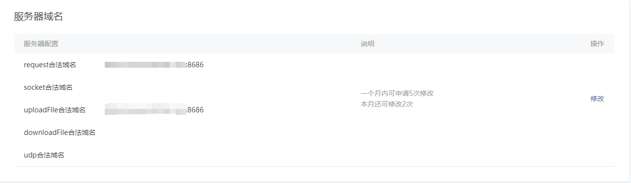 在配置服务器域名的时候,由于接口的前面加了端口号,而配置服务器的域名的时候,只配了域名,而没有加端口号,后来查看文档,才发现,如果接口加了端口,配置域名的时候,也要加上端口