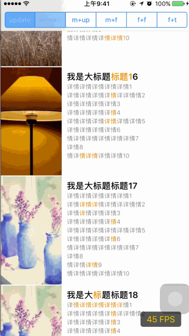 接下来,我们就不用Masonry来布局了,我们直接使用Frame布局。因为Autolayout最终仍然会转换为Frame布局的,很显然Frame布局在性能方面是优于Autolayout布局的。接下来我们就来使用Frame布局然后使用Frame更新。下方的FPS还算说得过去,不过还不是满格,其大部分原因就是因为NSAttrubitedString的原因了。