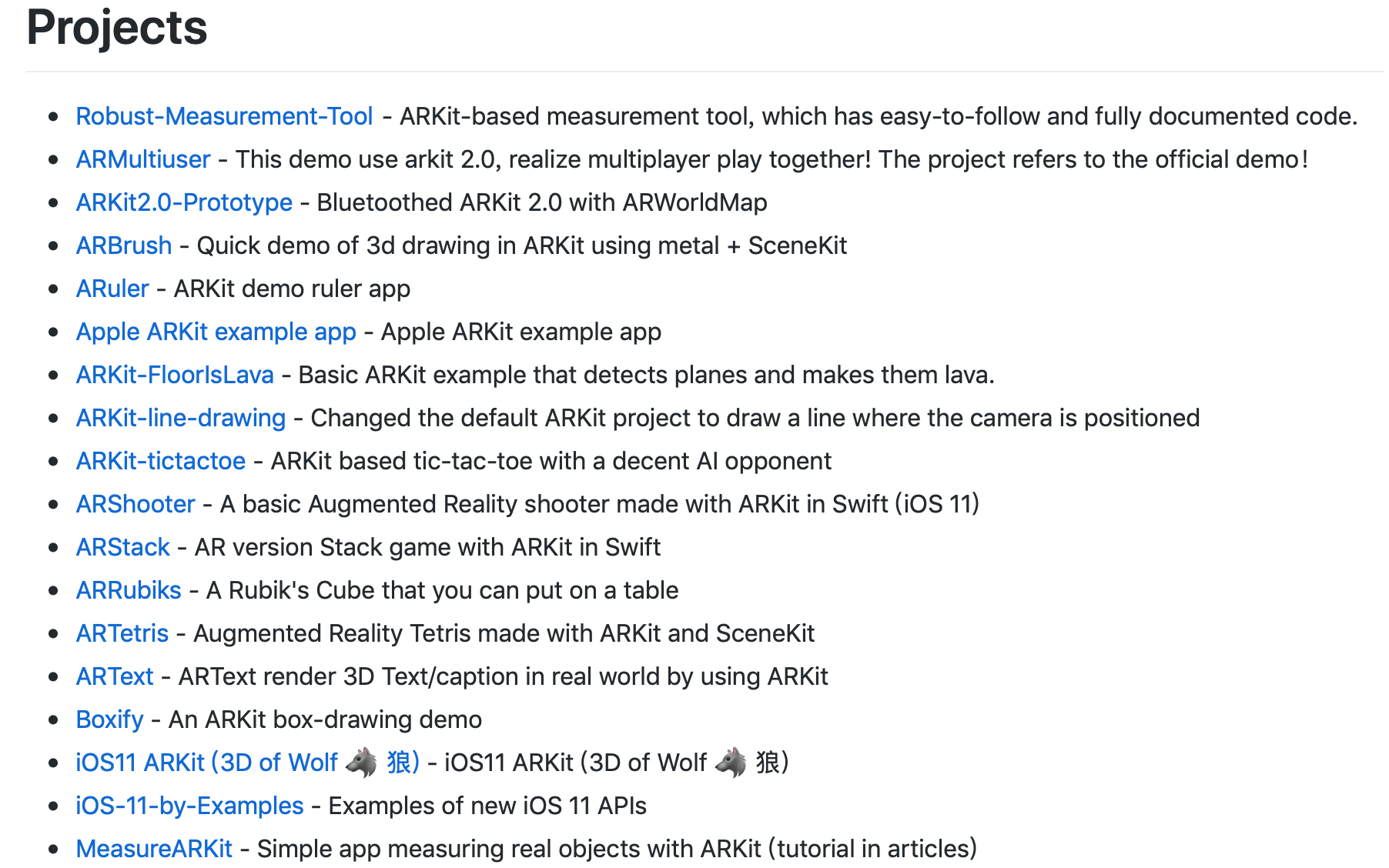 Awesome-ARKit包括了一系列的 AR 开源项目、app store 已上架应用、AR 教程文章、相关素材资源。除有个别项目比较陈旧,长期未更新,整体上包含了各种常见的 AR 效果,非常具有参考价值。