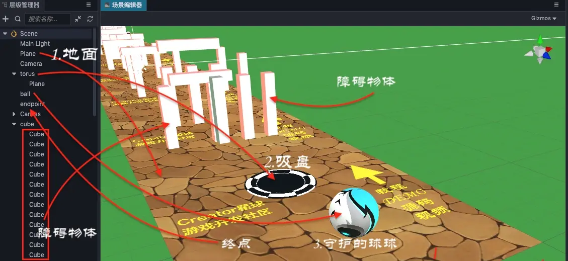 - 障碍物体:障碍物是 Cube 立方体搭建的,在节点上挂载了碰撞组件与刚体,当吸盘将柱子吸走后,上面的横条会下落碰到我们的守护球,这个掉落需要使用物理引擎来解决;