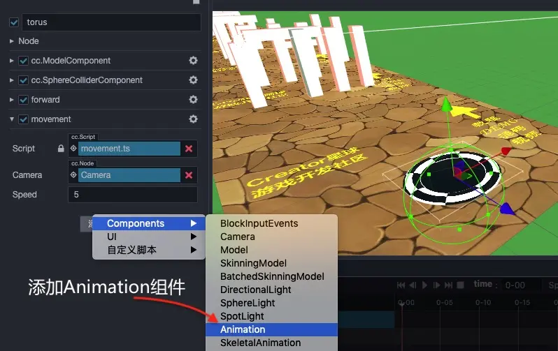 首先为 Torus 节点添加一个 Animation 组件,看下图:
