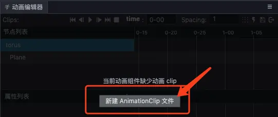 切换到动画编辑器窗口,点添加 AnimationClip,如图: