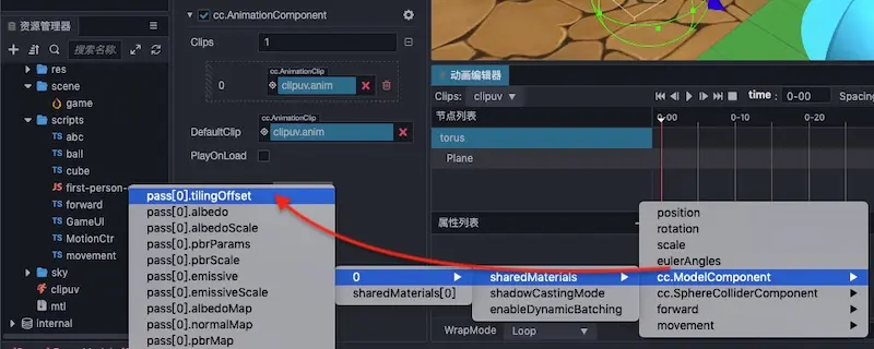在动画属性列表中,添加动画属性 tilingOffset,如图: