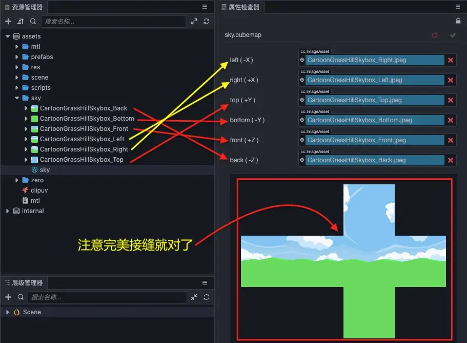 我在网上找了一个天空盒资源,设置天空盒6个面的图片,看下图:需要注意,我这个资源中的 Left 与 Right 在 Creator 中是需要交换一下,你可以看到下面的预览,六张图需要完美接缝。