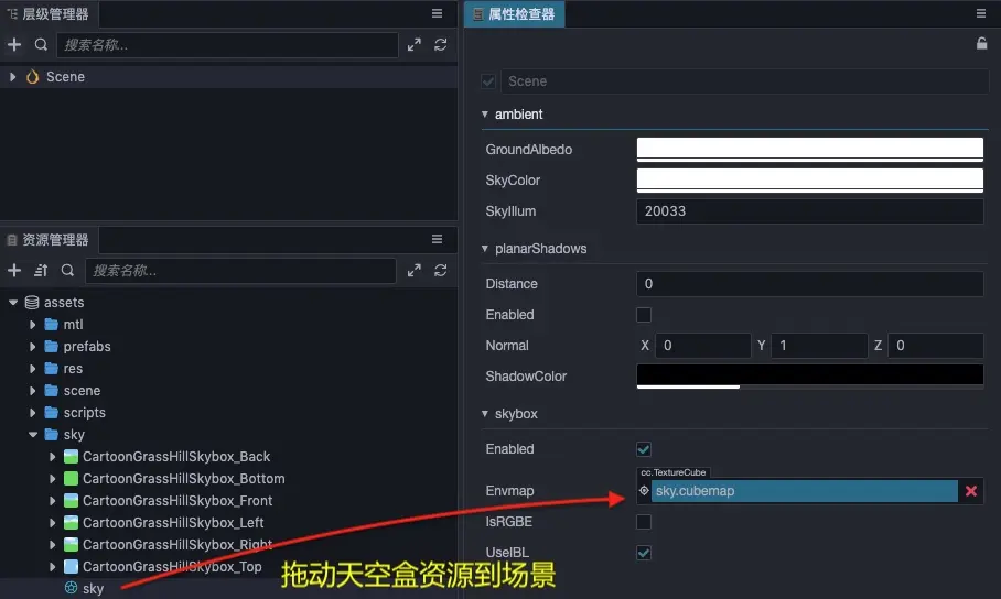 接下来选择 Scene 节点,将天空盒资源拖动到属性: