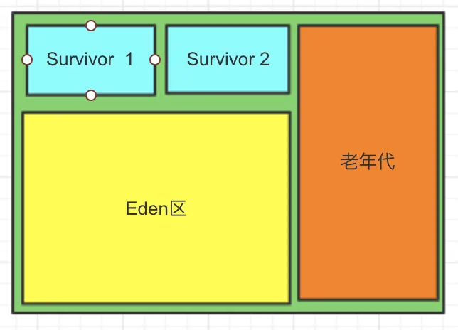 JVM堆中有新生代、老年代两块区域,因为使用分代回收策略新生代还会划分为Eden和两个Survivor区,JVM堆大概是这样子:
