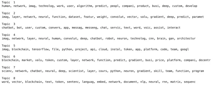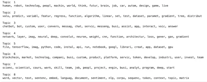 topic_names = ['Tech', 'Modeling', 'Chatbots', 'Deep Learning',