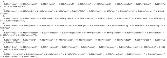 最后,试试LDA(潜在狄利克雷分布)。该算法最近在主题建模中很流行,很多人认为它最为先进。虽然如此,评估仍非常主观,结果不一定就比SVD或NMF要好。运行LDA需使用Gensim库,这意味着代码会有所不同。