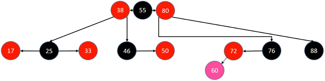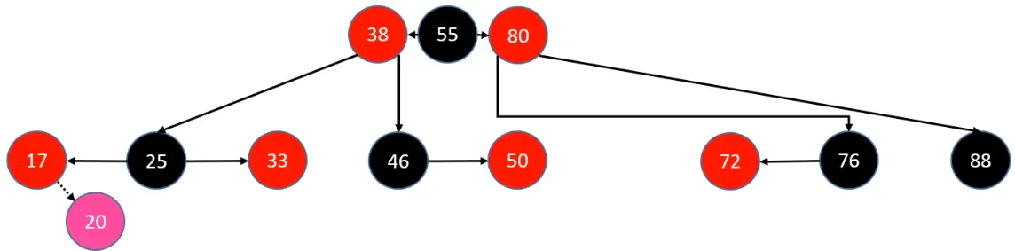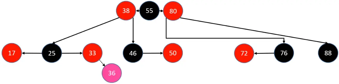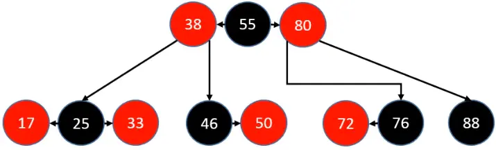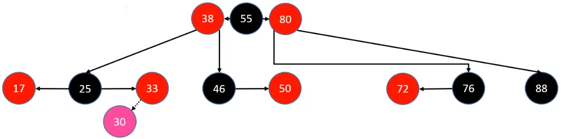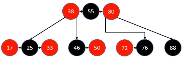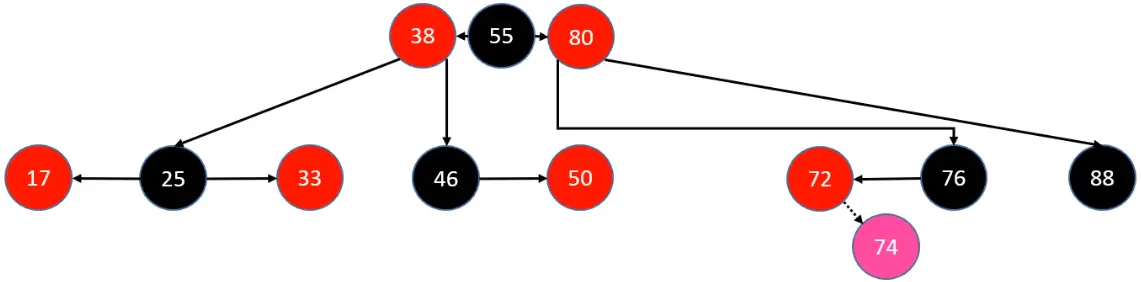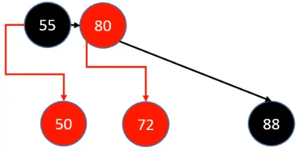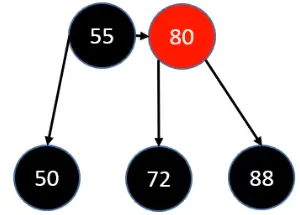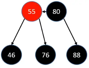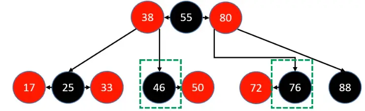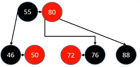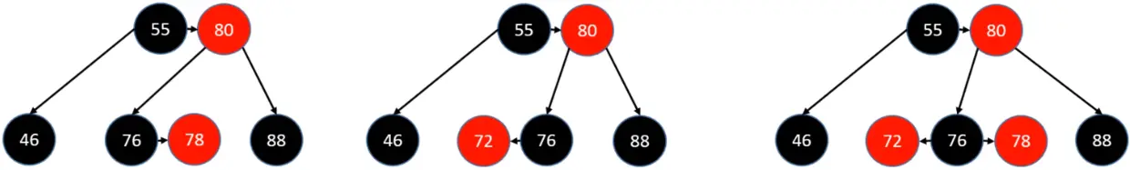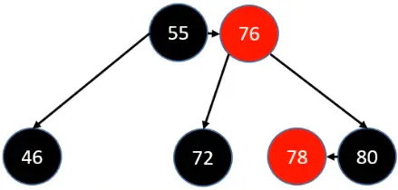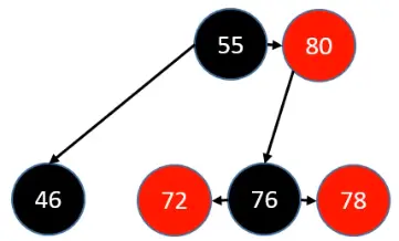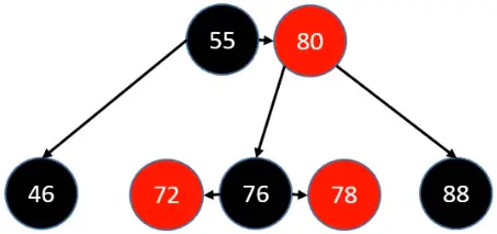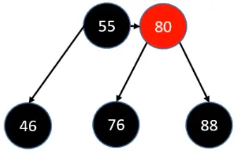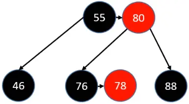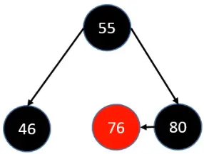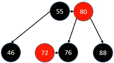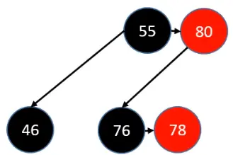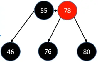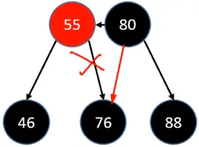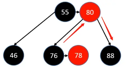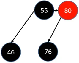 这个时候,我们可以对80进行右旋转,旋转以后,节点55就会成为80的父节点,然后76就成为了80的左子树节点,最后的结果为