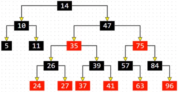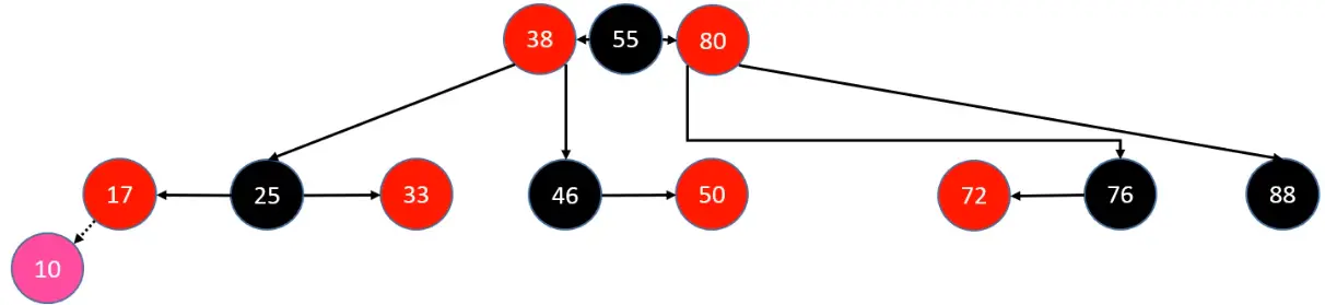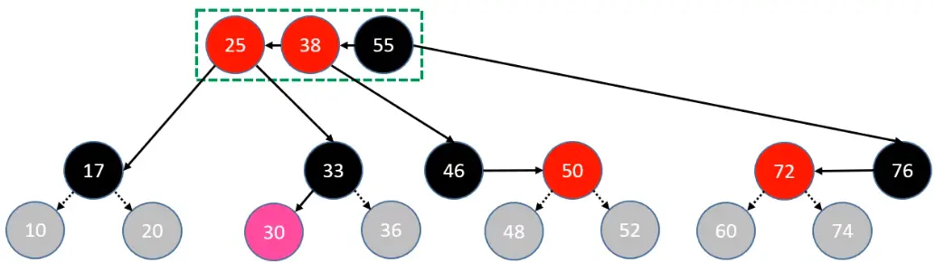 假设现有以下一棵红黑树,需要注意的是,学习红黑树的时候,要尽量和B树的知识点结合起来,并且看到红黑树的时候,就要能联想出B树的形状
