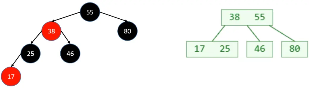 但是可能你又会有疑问,B树的矮是因为B树的一个节点存储的多个元素(如B树节点 38,55),但是将B树展开成为红黑树的时候,我们发现红黑树还是很高,如B树节点的38,55本来是一层的,展开成红黑树以后,我们发现变为了2层,B树节点17,25也如此。最终我们发现,高度为2的B树,展开成红黑树以后,高度变为了4。那么红黑树高度变得这么高,还叫平衡吗?说到这里,我们就要来回顾一下平衡的概念:给相同数目的节点,如果这些节点组成的二叉树,高度越低,我们就说这棵树越平衡,因此只要左右子树的高度差不要太夸张,就叫可以这棵树是平衡的。恰好,红黑树的平衡就是这种高度差不太夸张的平衡。红黑树的平衡可以保证高度差不会像二叉搜索树一样,可以夸张到最终二叉搜索树退化成为链表。