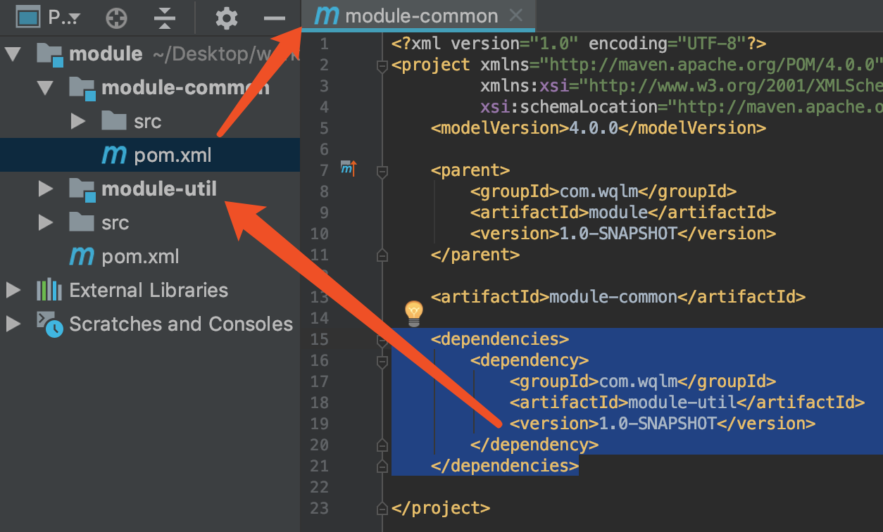 上图中子模块 module-common:1.0-SNAPSHOT 依赖了 module-util:1.0-SNAPSHOT。