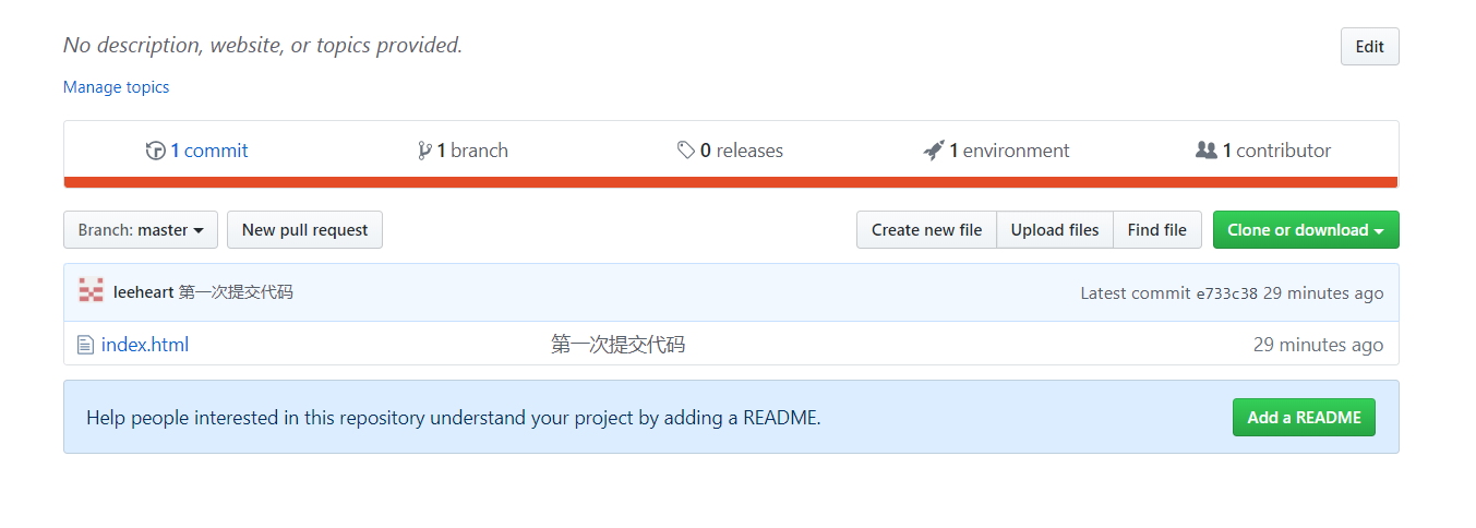 假设我们已经上传了一个本地仓库到 GitHub 上,我们在 Github 中打开这个仓库,仓库中已经有了一个 HTML 文件。