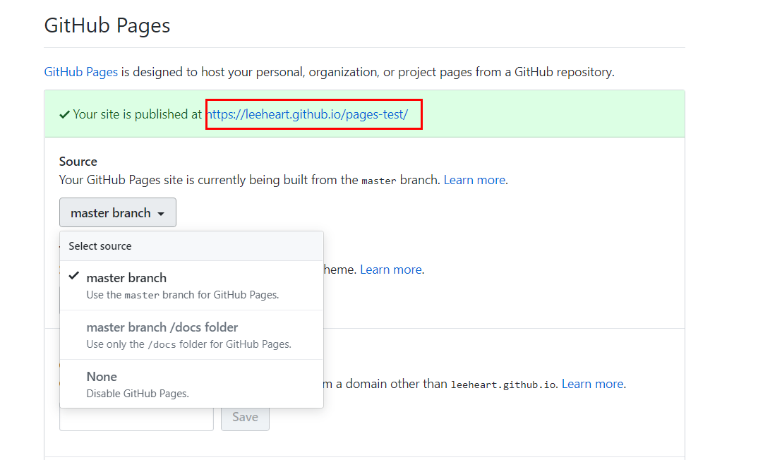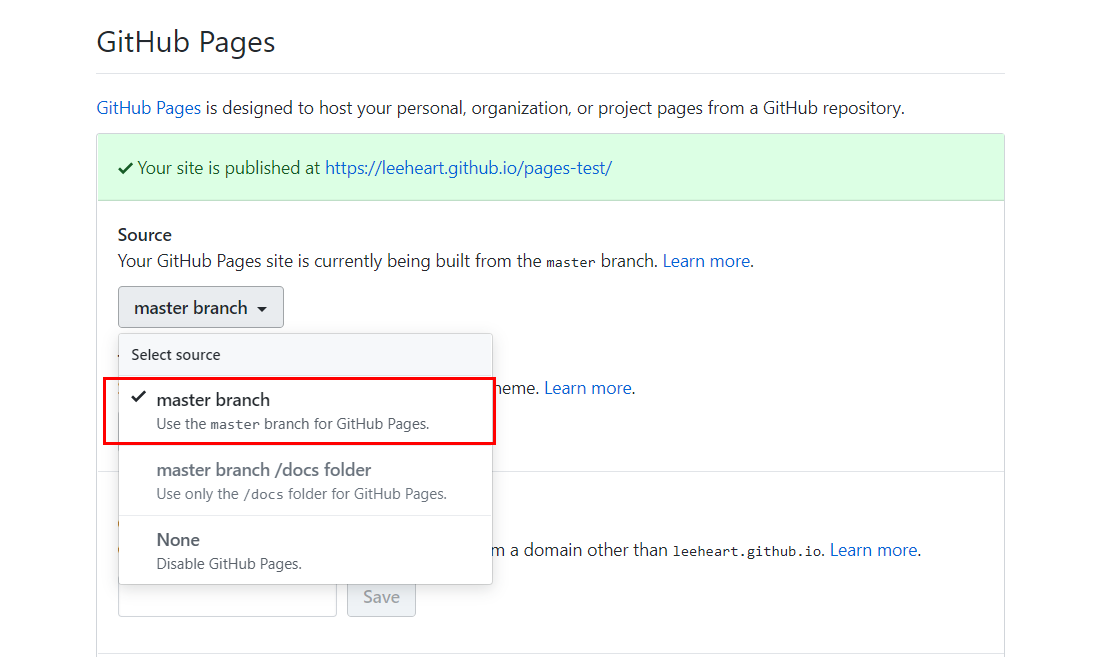 接下来我们开启 GitHub Pages 功能,点击 Settings,往下翻找到 GitHub Pages,选择 master branch,这时 GitHub Pages 就已经开启了