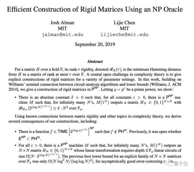 其中一篇最佳学生论文,Efficient Construction of Rigid Matrices Using an NP Oracle,是陈立杰与MIT博士、哈佛大学博士后Josh Alman合作的。