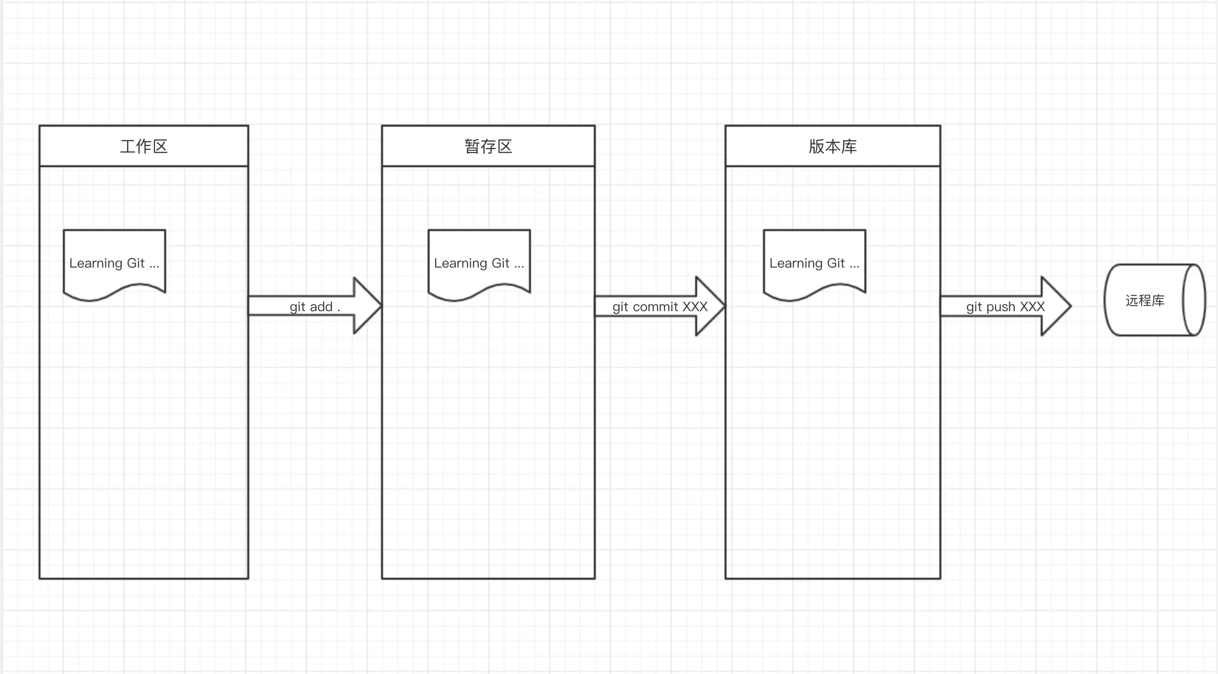 - 第四步:将本地版本库中的文件通过git push XXX 提交到远程库;(此时远程库和本地库保持同步)