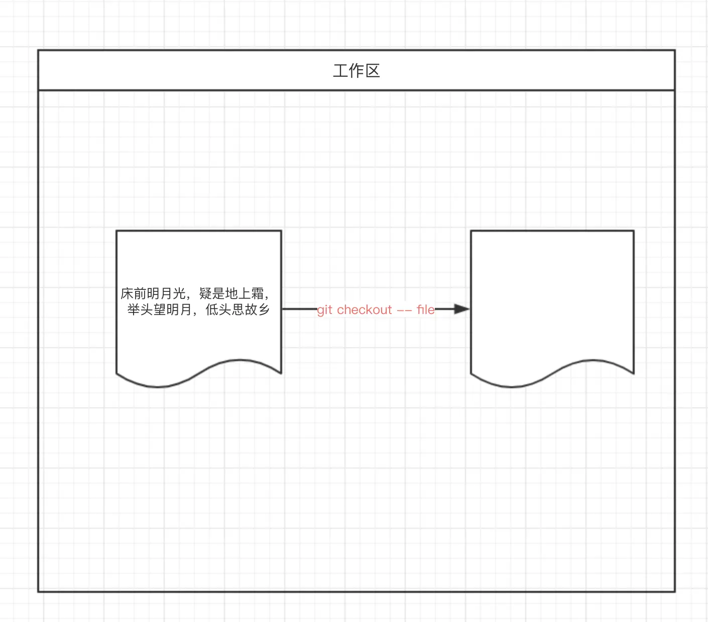 假如当前项目开发需要创建一个文件,记录项目的主要版本。我们在工作区中修改文件 ReadMe.txt ,文件中内容是“床前明月光,疑是地上霜,举头望明月,低头思故乡”。发现文件内容是错误的,我们需要回退到上次的版本,可以通过git checkout -- ReadMe.txt 进行撤销;