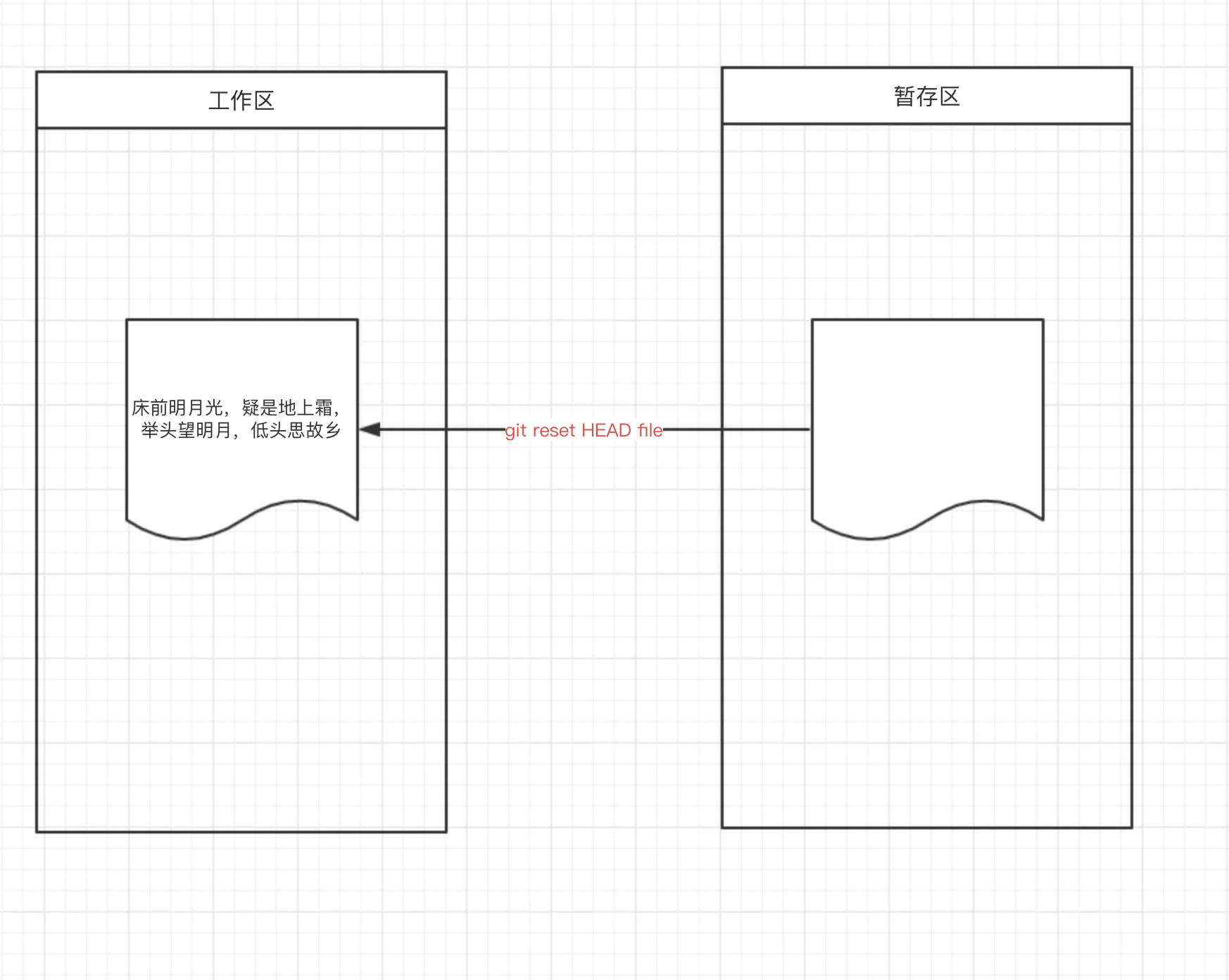假如文件 ReadMe.txt “床前明月光,疑是地上霜,举头望明月,低头思故乡” 已经通过git add Version.txt 提交到暂存区我们才发现文件是错误的,这时可以通过 git reset HEAD ReadMe.txt 将文件从暂存区撤回到工作区,工作区中的文件状态就是我们提交之前的文件数据;