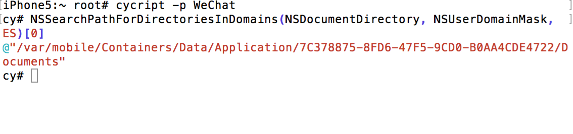 寻找沙盒Documents具体路径,我们需要用Cycript找出微信的Documents具体路径。输入命令cycript -p WeChat