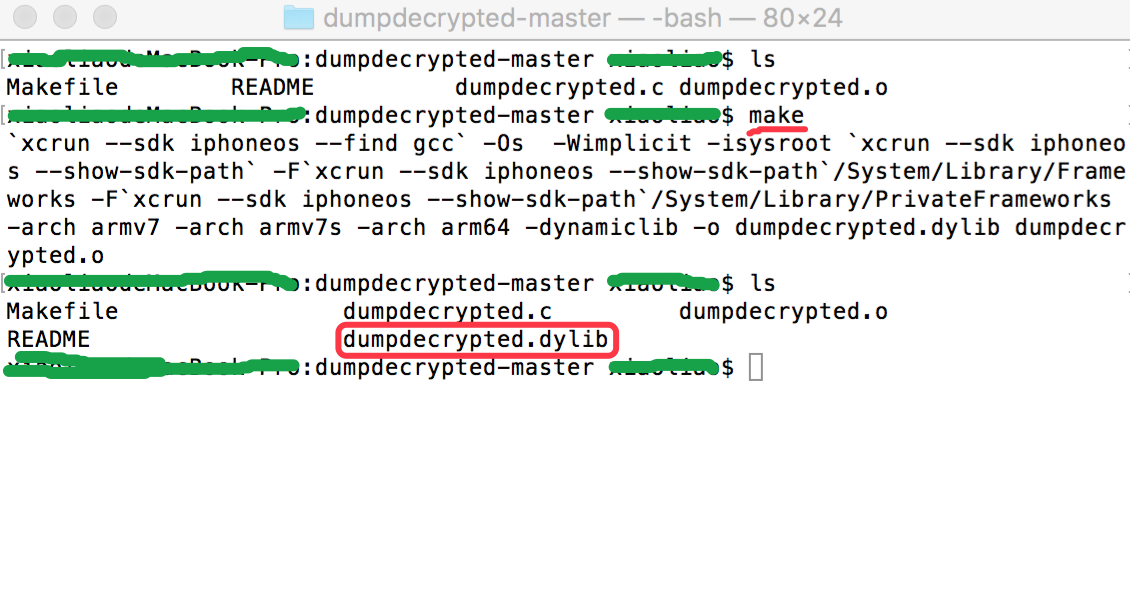 进入dumpdecrypted源码的目录,输入指make来编译dumpdecrypted。一般make后会在当前目录下生成一个dylib文件。