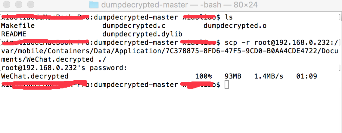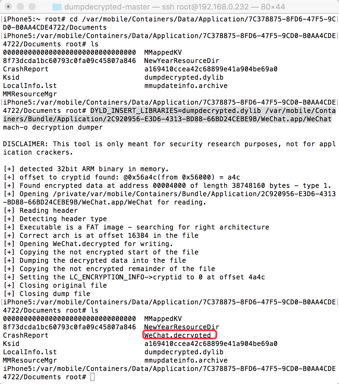 这样就代表砸壳成功了,当前目录下会生成砸壳后的文件,即WeChat.decrypted。同样用scp命令把WeChat.decrypted文件拷贝到电脑上,接下来我们要正式的dump微信的可执行文件了。