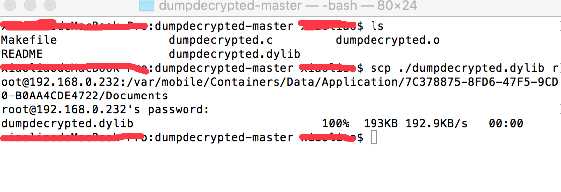 使用scp指令把dumpdecrypted.dylib拷贝到iPhone的Documents路径目录下输入指令:scp 源文件路径:目标文件路径