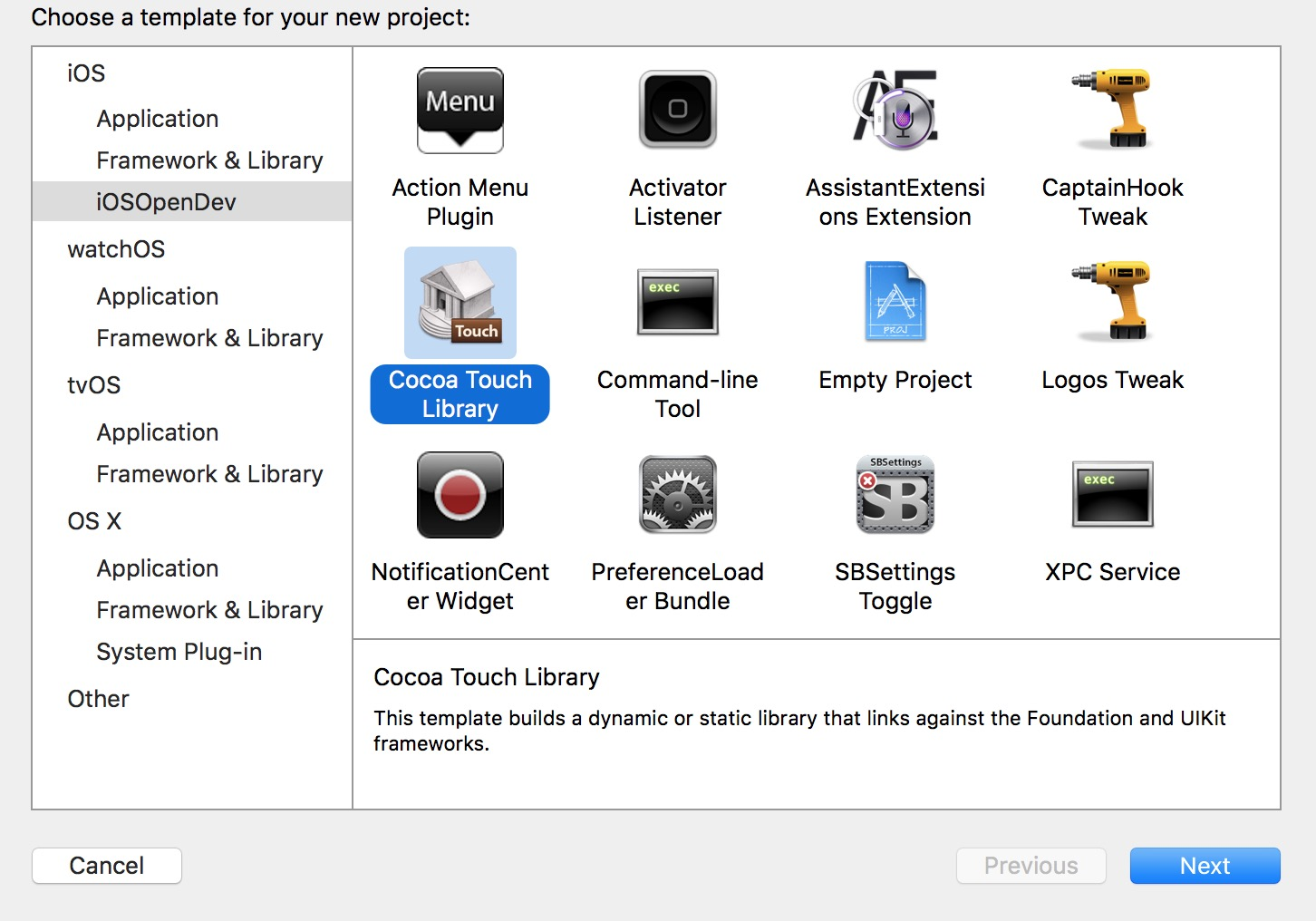 - 新建一个dylib工程,因为Xcode默认不支持生成dylib,所以我们需要下载iOSOpenDev,安装完成后(Xcode7环境会提示安装iOSOpenDev失败,请参考iOSOpenDev安装问题),重新打开Xcode,在新建项目的选项中即可看到iOSOpenDev选项了。