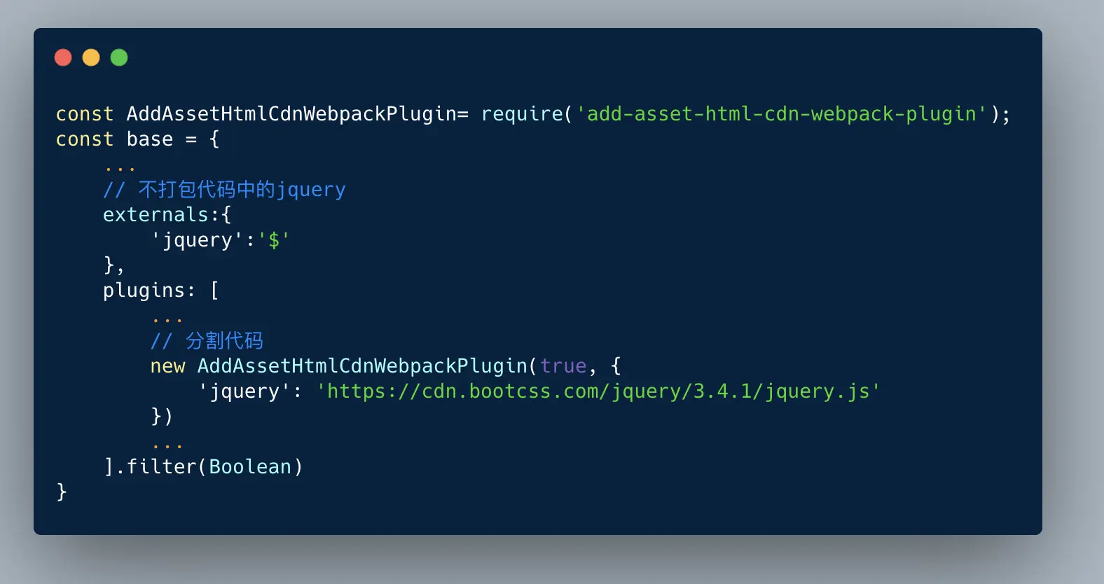 我们并不希望打包cdn引入文件,因为这会造成main.bundle.js文件体积臃肿,在一定程度上会影响页面的渲染速度