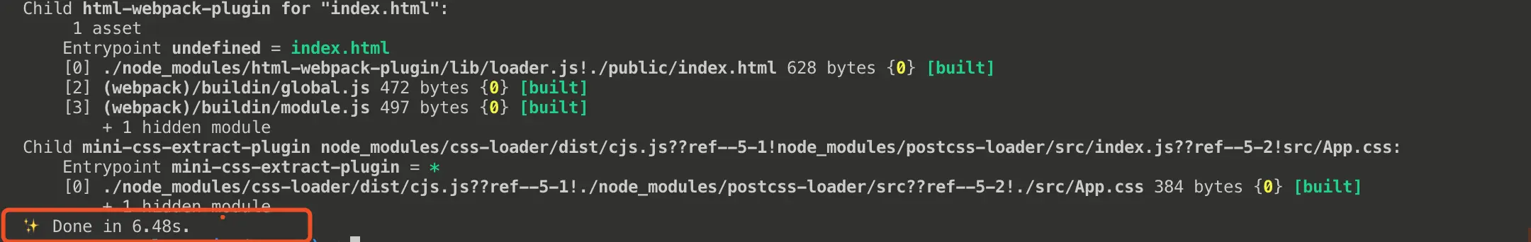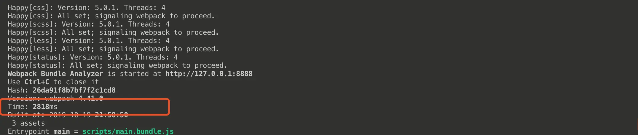 我们可以看到,打包时间明显缩短了,所以happypack是一个很好的提高打包速度的手段