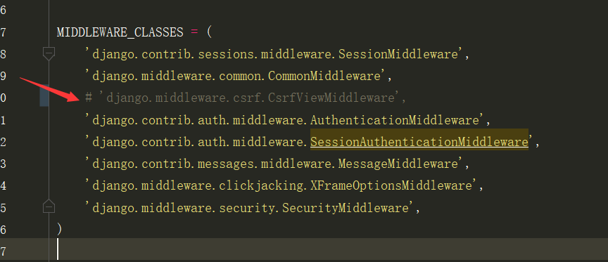 8)Django项目中默认启用了csrf保护,现在先禁用,打开第一个项目中的mysite/settings.py文件,注释掉csrf中间件。