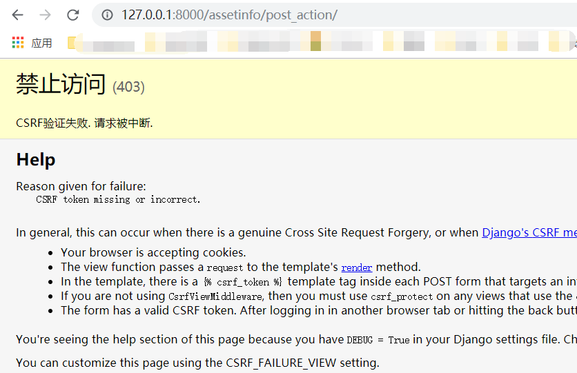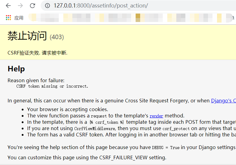 说明:当启用中间件并加入标签csrf_token后,会向客户端浏览器中写入一条Cookie信息,这条信息的值与隐藏域input元素的value属性是一致的,提交到服务器后会先由csrf中间件进行验证,如果对比失败则返回403页面,而不会进行后续的处理。