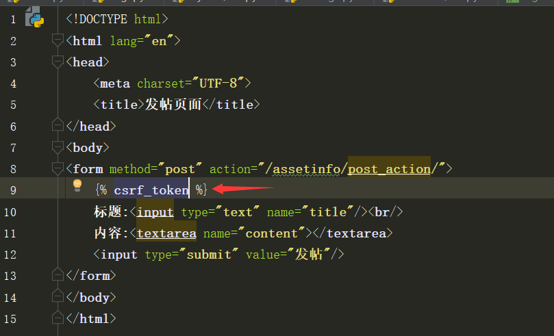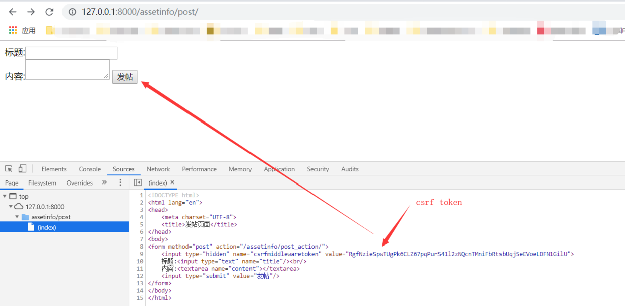 3)这下麻烦了,因为网站A自己也不能访问了,接下来templates/assetinfo/post.html内容,在form表单中使用标签csrf_token。