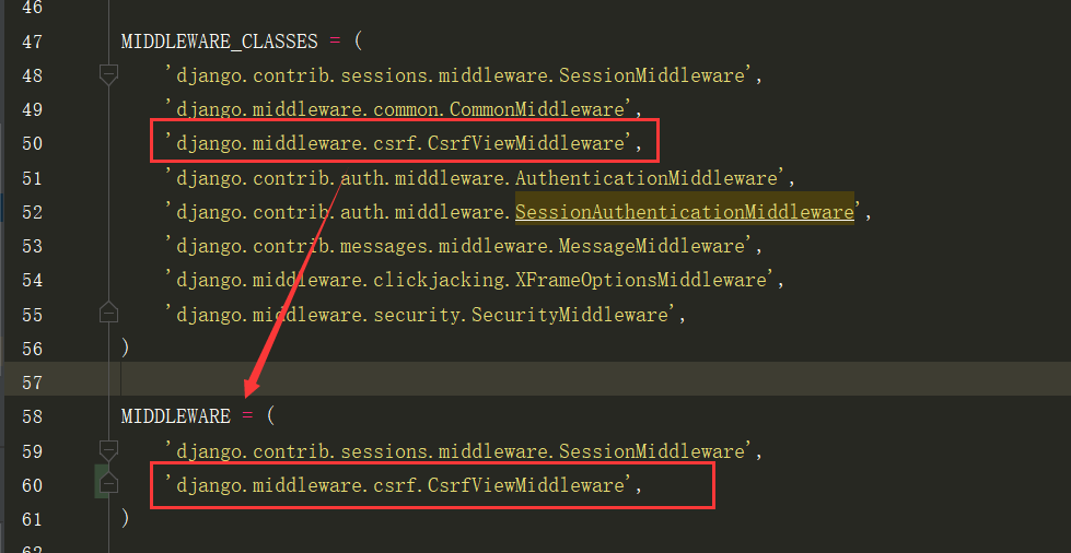 要注意,Django 2 开始开启中间件不是默认生产的MIDDLEWARE_CLASSES中编写,需要写到MIDDLEWARE中,如下: