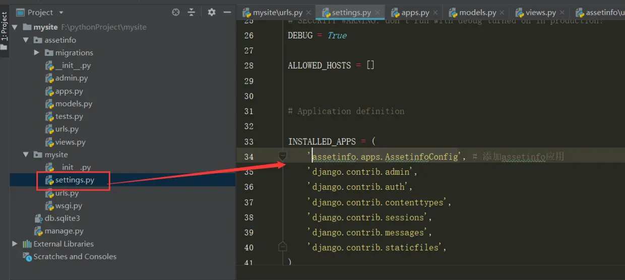 为了在我们的工程中包含这个应用,我们需要在配置类 INSTALLED_APPS 中添加设置。因为 AssetinfoConfig 类写在文件 assetinfo/apps.py中,所以它的点式路径是 'assetinfo.apps.AssetinfoConfig'。在文件 mysite/settings.py 中 INSTALLED_APPS 子项添加点式路径后,它看起来像这样:
