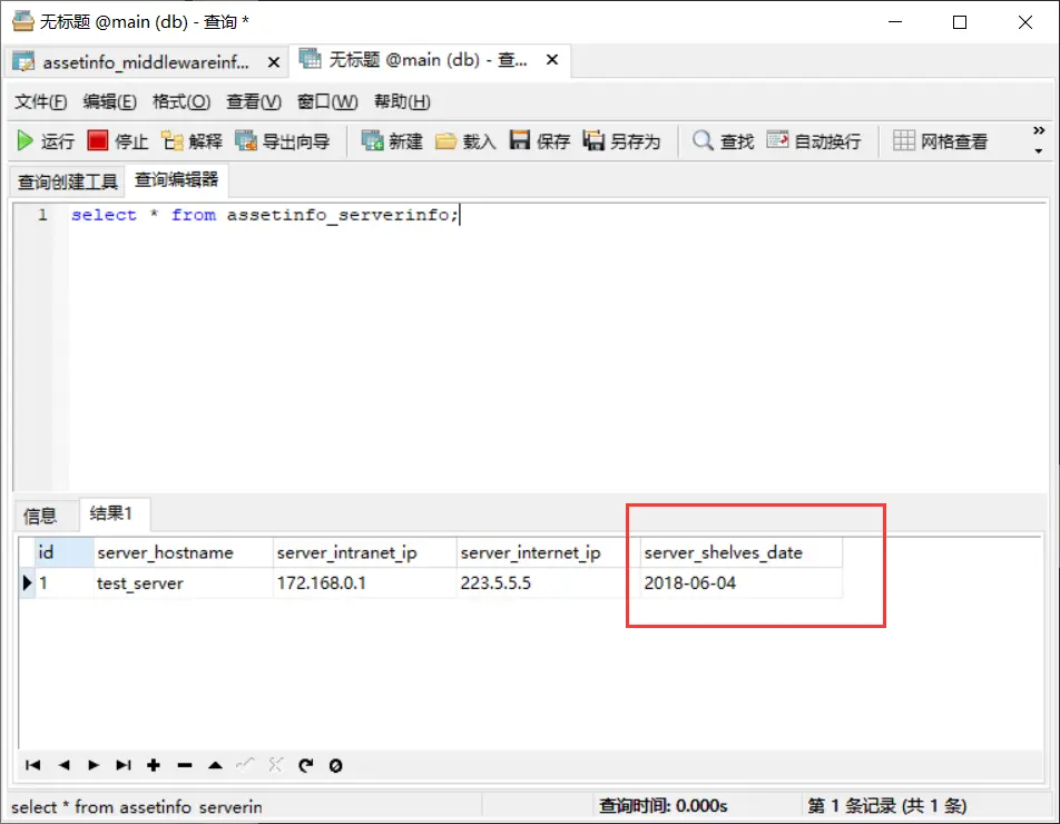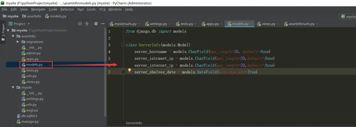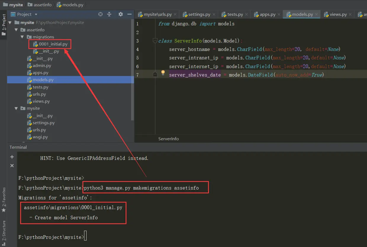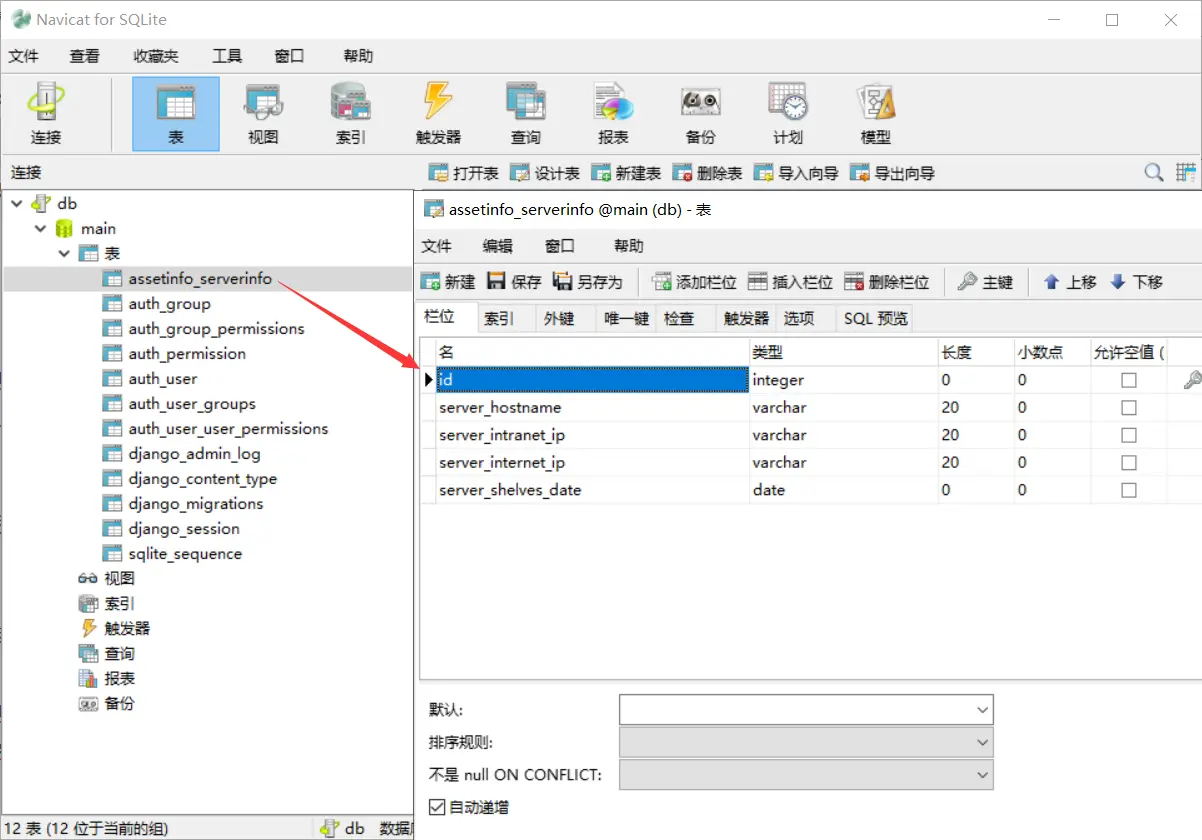 细心的读者会发现上面生成的表的名字叫做assetinfo_serverinfo,assetinfo是应用的名字,serverinfo是模型类的名字。
