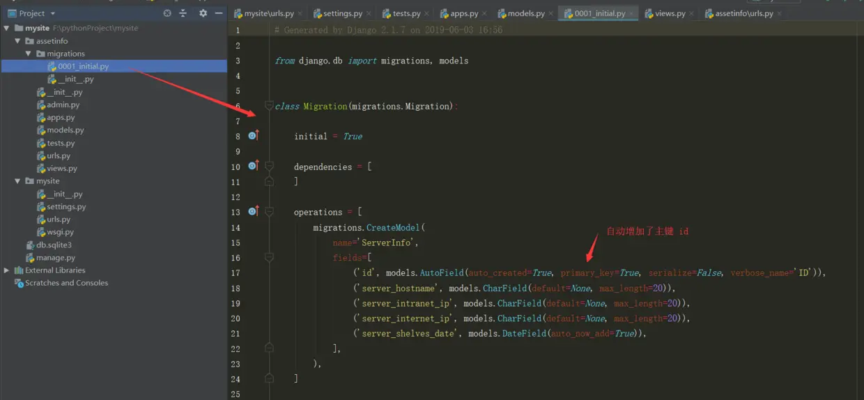 Django框架根据我们设计的模型类生成了迁移文件,在迁移文件中我们可以看到fields列表中每一个元素跟Serverinfo类属性名以及属性的类型是一致的。同时我们发现多了一个id项,这一项是Django框架帮我们自动生成的,在创建表的时候id就会作为对应表的主键列,并且主键列自动增长。