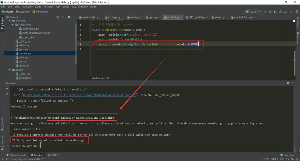 在外键值的后面加上 on_delete=models.CASCADE