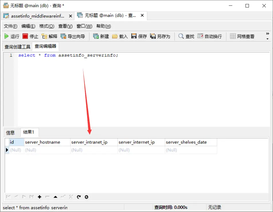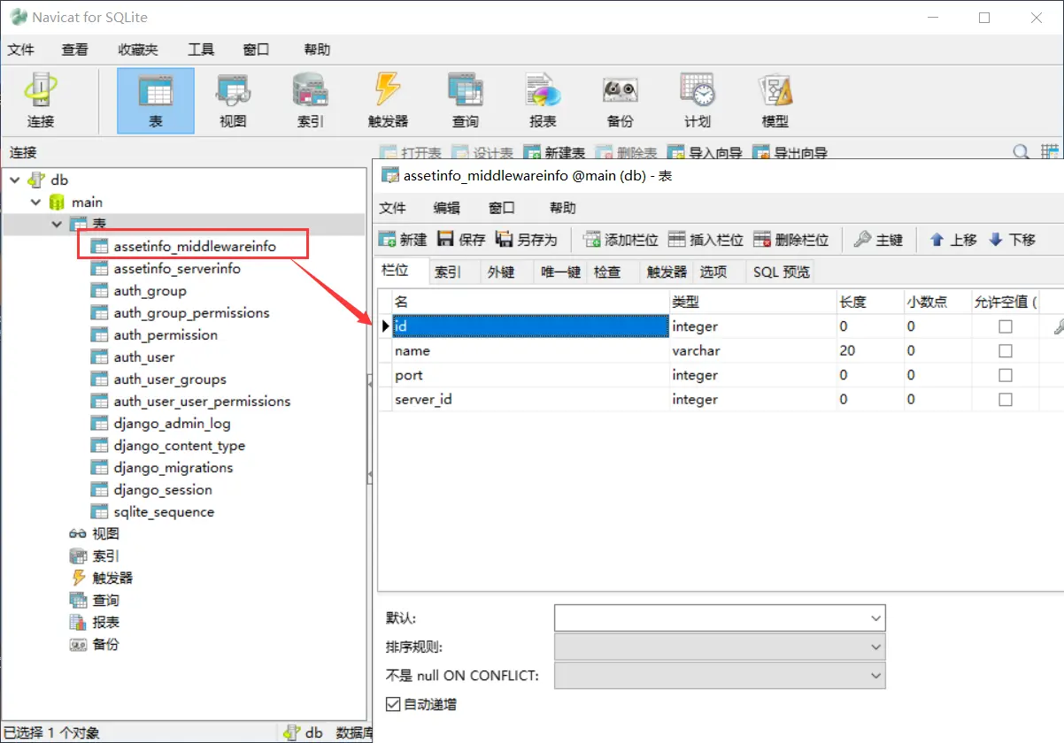 注意上图中assetinfo_middlewareinfo表中有一列server_id,这一列名为什么不叫server? server_id是根据MiddlewareInfo类的关系属性server生成的,对应着服务器表中的主键id。