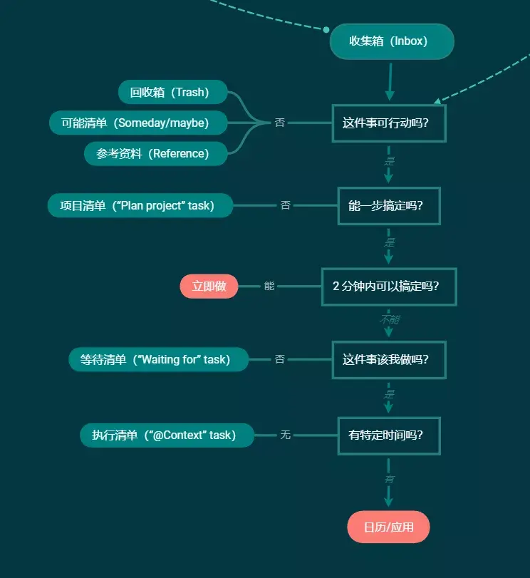 根据 GTD 的法则,永远不要把已经丢到其他分类的东西放回收集箱,并且定时整理,那么收藏不读的问题,就不会出现。