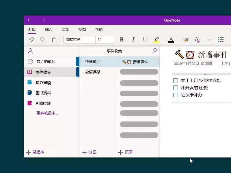 以我自己的 OneNote 为例,在基础 GTD 的情况下,做了些个人化的调整,把笔记本分为:事件收集、待办事项、图书资料和回收站四个。