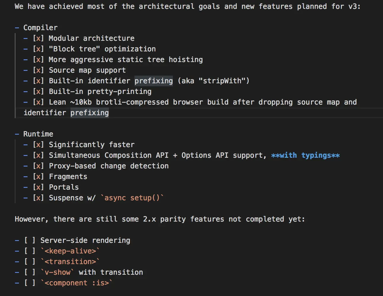 当前状态Pre-Alpha。如果有版本概念的同学此处可以略过,没有的可以点此软件版本了解巩固一下,后续发布公司或者个人的项目时注意版本及命名等区分。特性功能说明vue3 Readme里的主要内容是架构目标及新特性的说明。可以简单了解