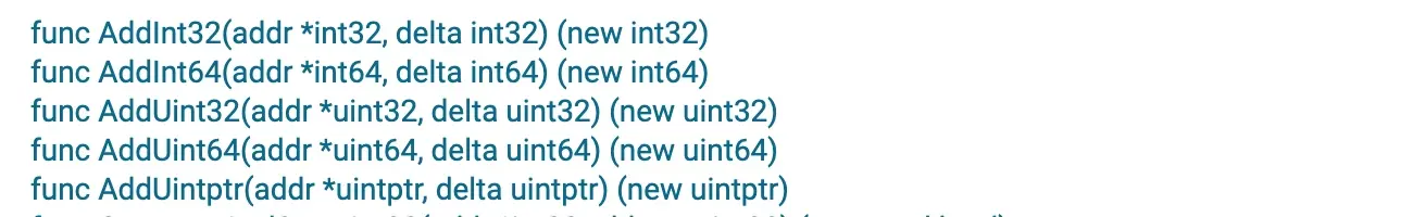 我们可以通过 atomic 包提供的下列函数实现加减法的原子操作,第一个参数是操作数对应的指针,第二个参数是加/减值: