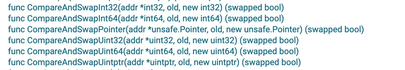 原子操作通常是 CPU 和操作系统提供支持的,由于执行过程中不会中断,所以可以完全消除竞态条件,从而绝对保证并发安全性,此外,由于不会中断,所以原子操作本身要求也很高,既要简单,又要快速。Go 语言的原子操作也是基于 CPU 和操作系统的,由于简单和快速的要求,只针对少数数据类型的值提供了原子操作函数,这些函数都位于标准库代码包 sync/atomic 中。这些原子操作包括加法(Add)、比较并交换(Compare And Swap,简称 CAS)、加载(Load)、存储(Store)和交换(Swap)。